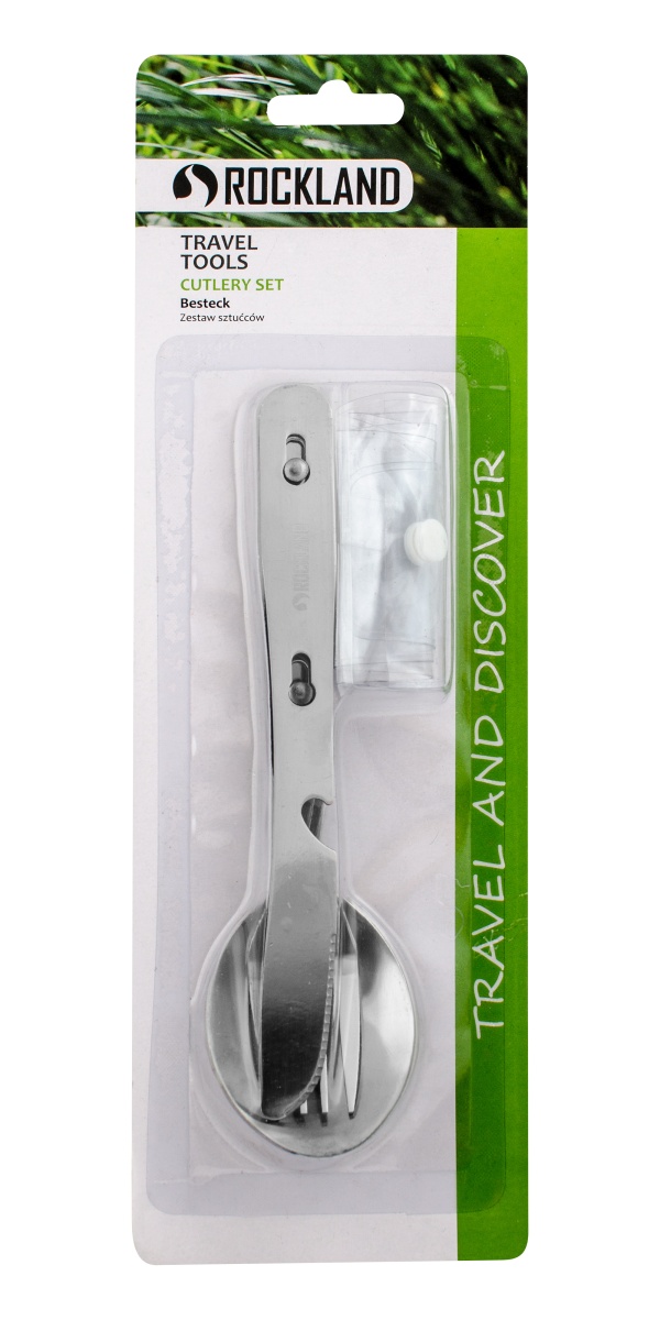 Třídílná souprava příborů pro turistické večeře se čtyřmi funkcemi. Lžíce, vidlička, nůž / otvírák, vyrobené z nerezové oceli.