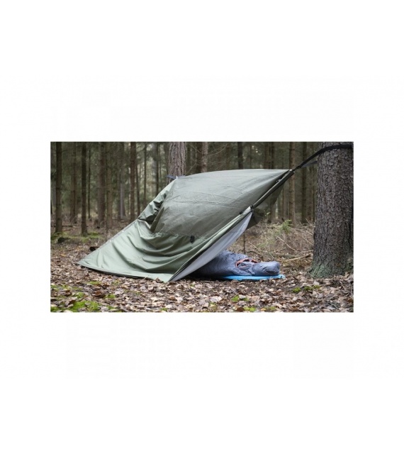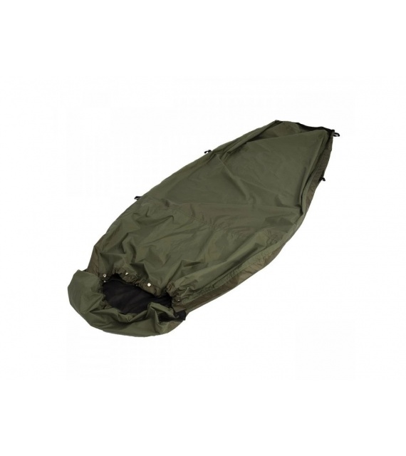 Bivouac bag with increased water resistance. BIVAK BAG with a long zipper down to the legs and added loops. The bag can be completely unzippered and unfolded. It can be used as a sheet for lying down or for throwing over two sleeping bags. It can also be used as a tent sheet to create an emergency shelter. Mosquito net in the head area.