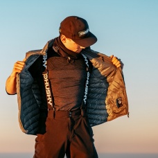 An ultralight, men’s, down zip-up gilet suitable for various outdoor activities on colder days.