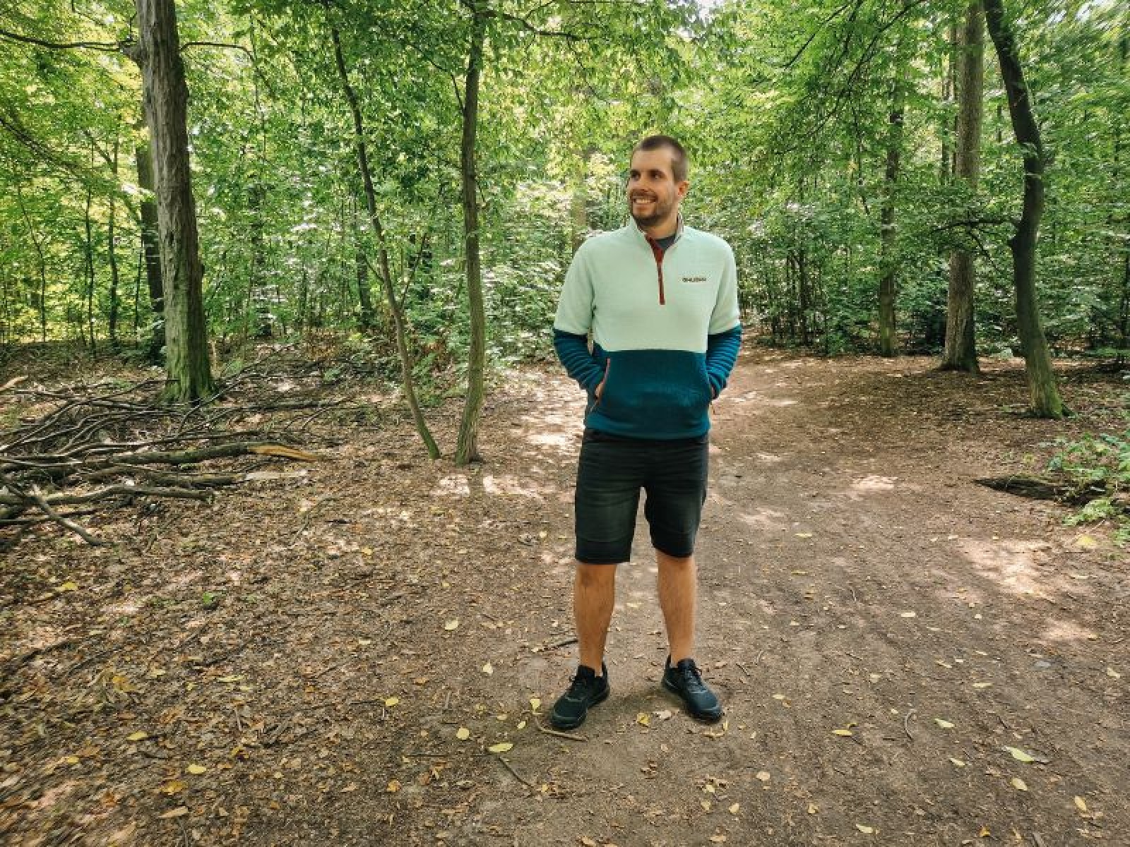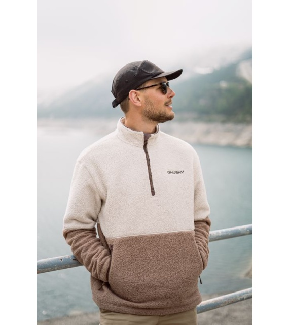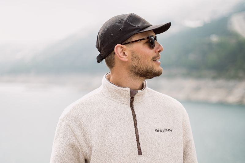 A heavier men's sweater with a zip neck, suitable for various outdoor activities.