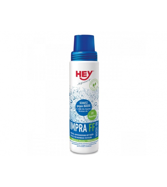 HEY SPORT® Impra FF Wash-In je impregnace, která se přidává k prádlu při praní a zajišťuje plnou ochranu proti vodě při zachování prodyšnosti. Vhodné zejména pro textilie s membránami a nanotechnologiemi. Perfektní ochrana vláken. HEY SPORT® Impra FF Wash-In impregnuje všechny textilie z přírodních a syntetických vláken. Udržuje aktivní prodyšnost a svěží barvy. Ekologický výrobek bez obsahu fluoru.