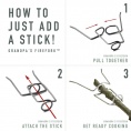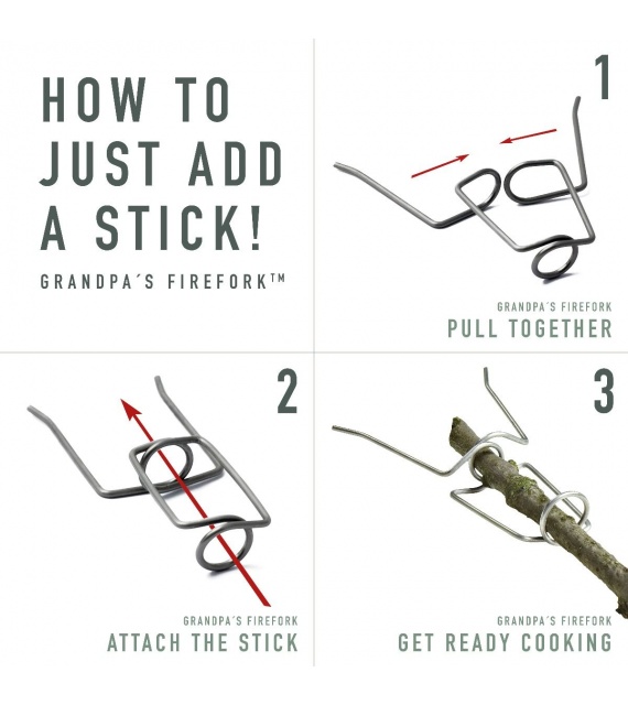 Všichni víme, že dědové mají své zvláštní způsoby. Tato skvělá stavebnice vzešla z inovativního nápadu dědečka vyrobit držák na jídlo, když vařili u táboráku. Grilujte všechny klasiky a mnohem více pomocí tohoto důmyslného, praktického a jednoduchého malého nástroje. Pevně se připojuje ke každé tyči, kterou najdete, a dokonce je z ní vynikající ohnivý poker. Je to skvělý nápad, který grilování pod širým nebem přidává další kousek zábavy. Čepice vyrobená z bioplastu a vidlička z nerezové oceli.