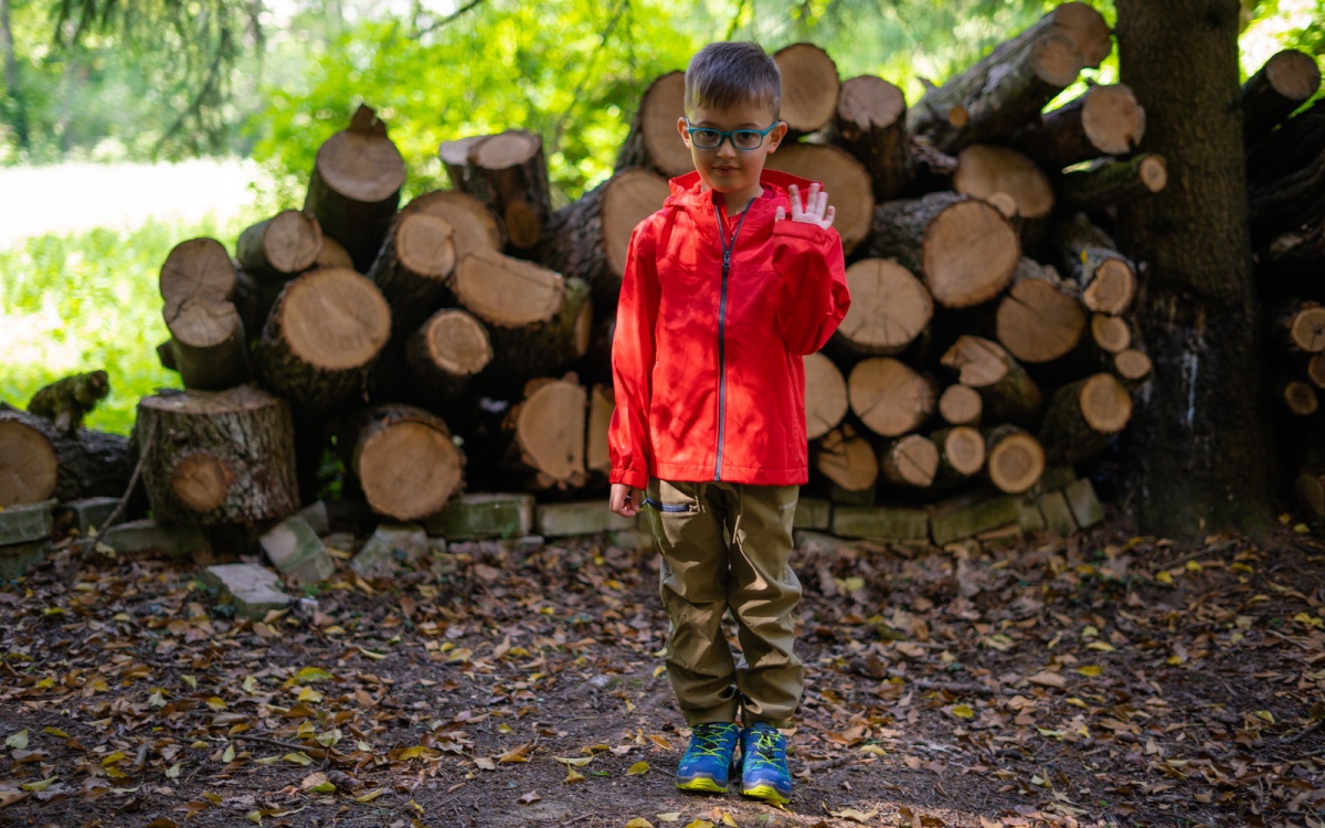 Gyermekeknek való, kapucnis, membrános outdoor dzseki tavaszi és őszi szabadtéri tevékenységekhez.