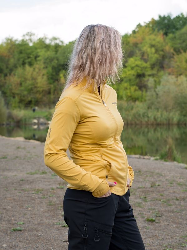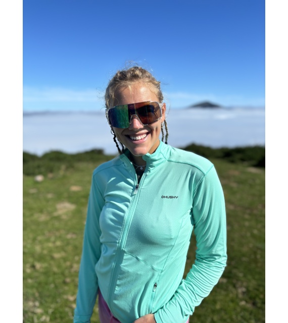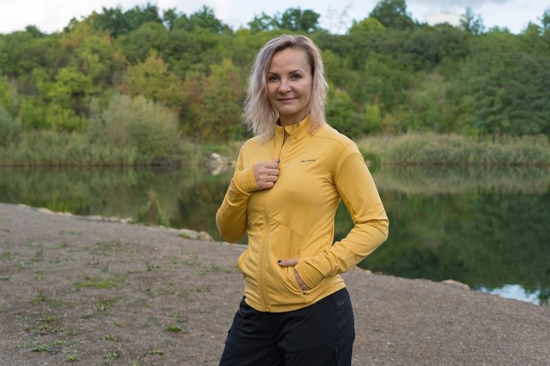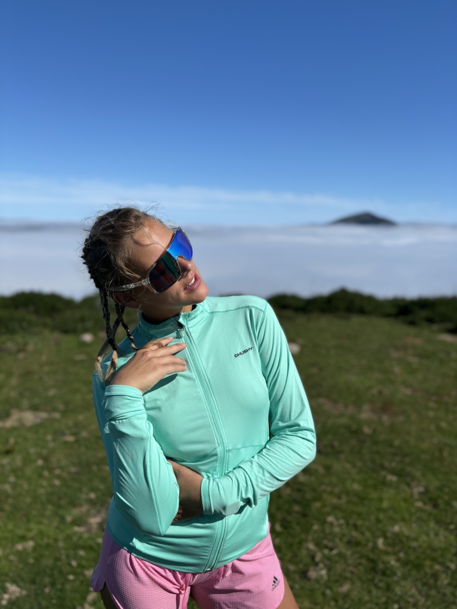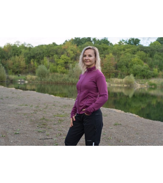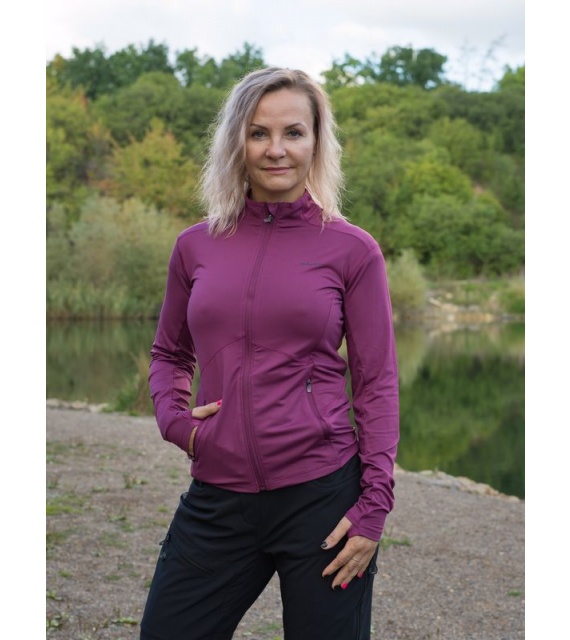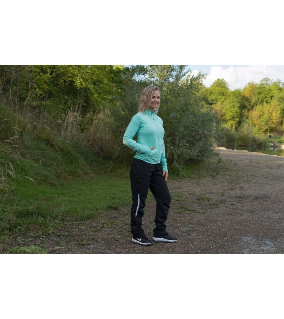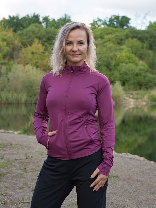A női funkcionális cipzáras pulóver ideális sportoláshoz és aktív mozgáshoz a természetben.