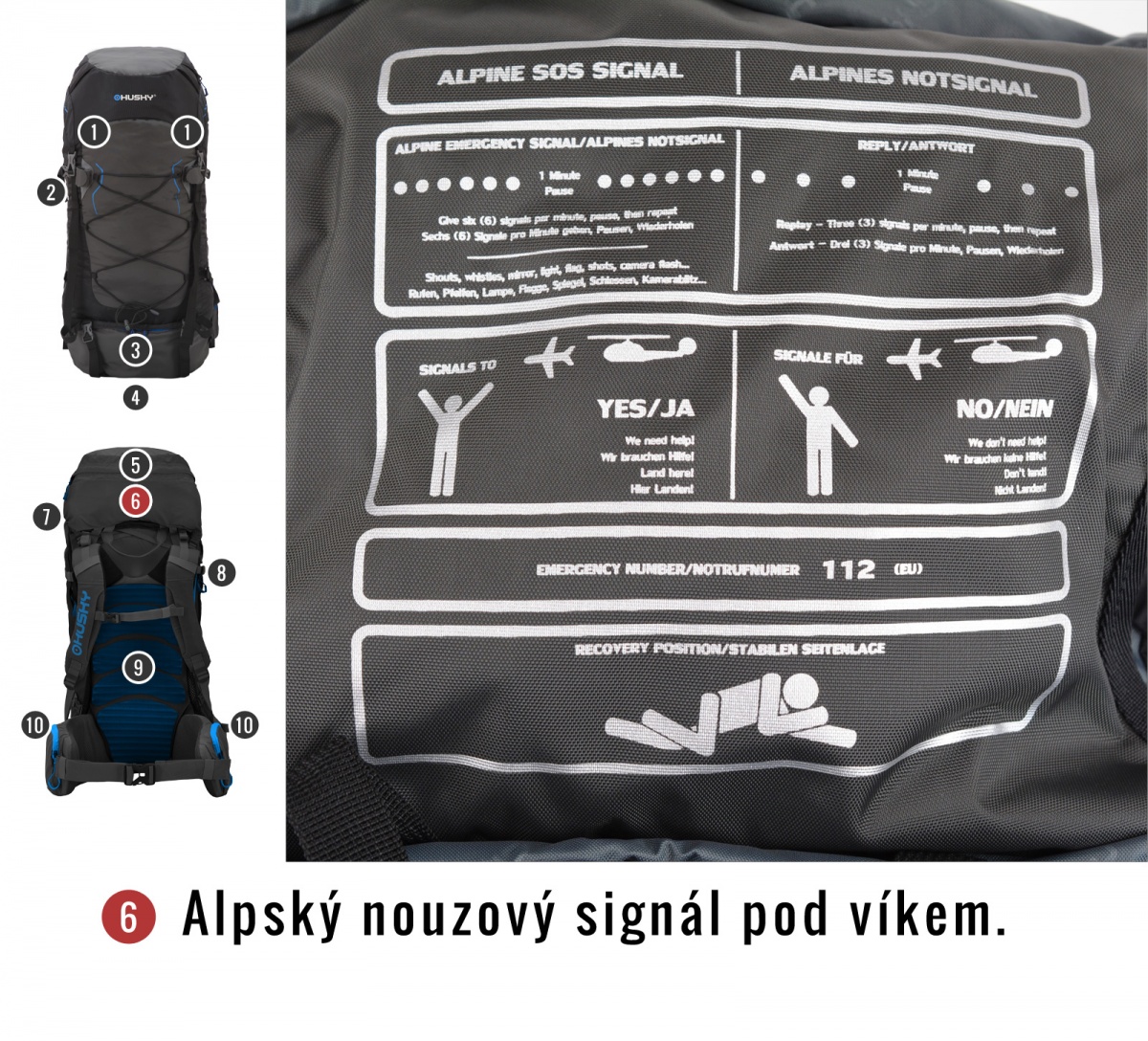 Levehető fedél, mellkasi pánt, derékpánt, esővédő, vészjelző szimbólumok.
