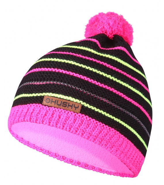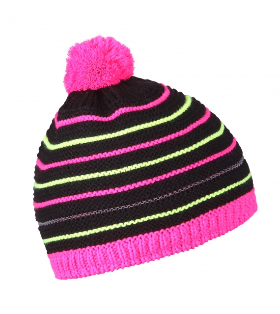 Kinder gebreide muts met fleece voering, pompon en neon gestreept patroon.
