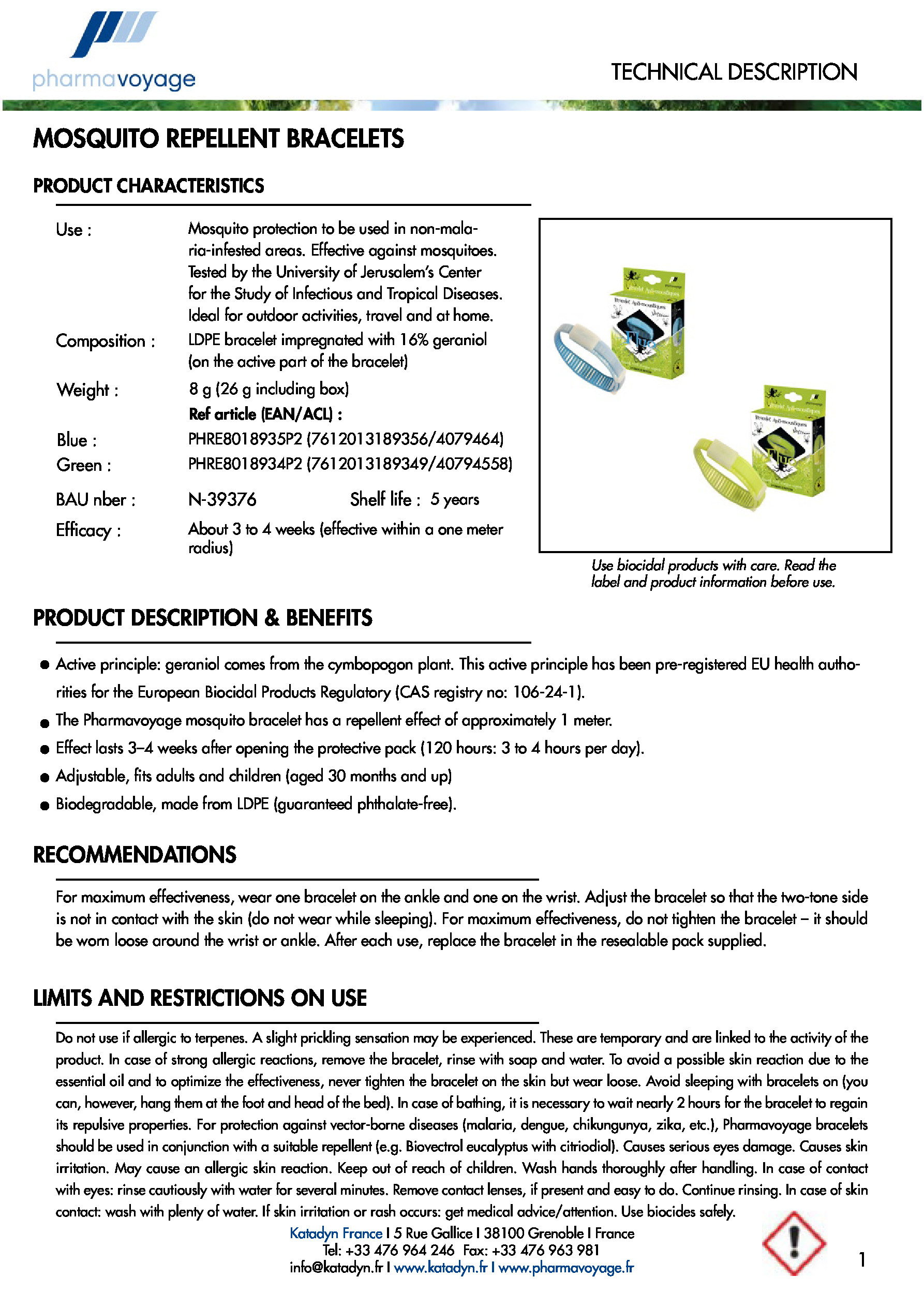 Náramek je vyroben z měkkého plastu, obsahuje repelent na 100 % přírodní bázi (geraniol, sójový olej) a poskytuje non-stop ochranu po dobu 3 - 4 týdnů.