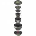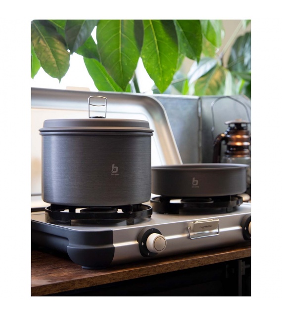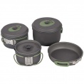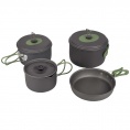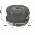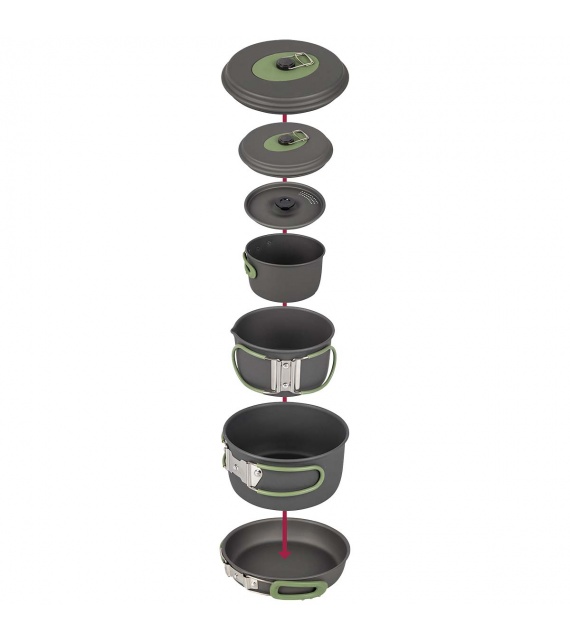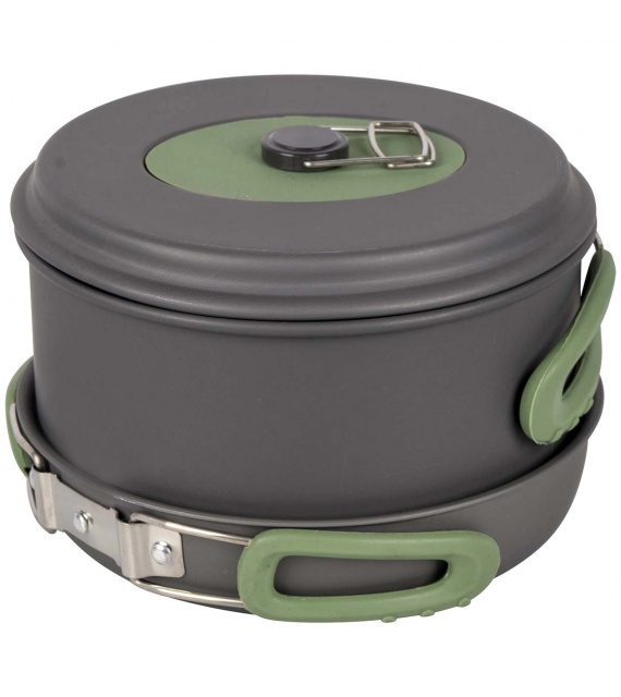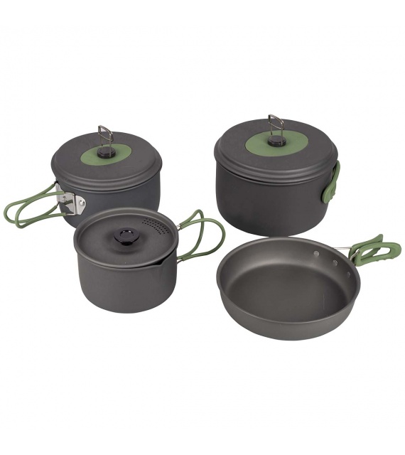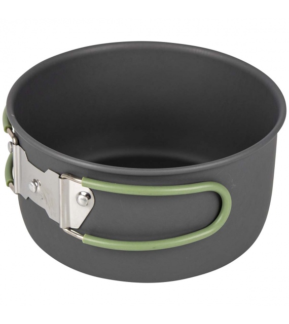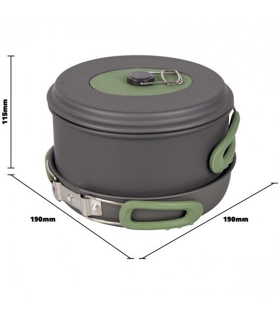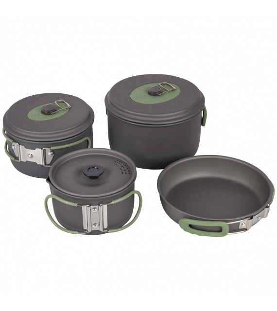 Kompletní 4dílná lehká sada na vaření. Tato sada nádobí se skládá ze 3 hrnců s poklicí a pánve. Ideální pro venkovní použití. Vhodné pro plynové a benzínové hořáky. Vyrobeno ze silného tvrdého eloxovaného hliníku, který snižuje riziko přilepení. Každá pánev je vybavena žáruvzdornou silikonovou skládací rukojetí. Tyto rukojeti lze po použití snadno složit kolem pánve, díky čemuž jsou pánve kompaktní pro skladování a přepravu. Včetně pouzdra. Rozměry hrnců (Øxv): 13,5x7,5, 15,5x8,5 a 17,5x10,5 cm. Rozměry pánve (Øxv): 18x4,5 cm. Vnořené rozměry (Øxv): 19x11,5 cm. Kapacita: 1, 1,4 a 2,2 litru.